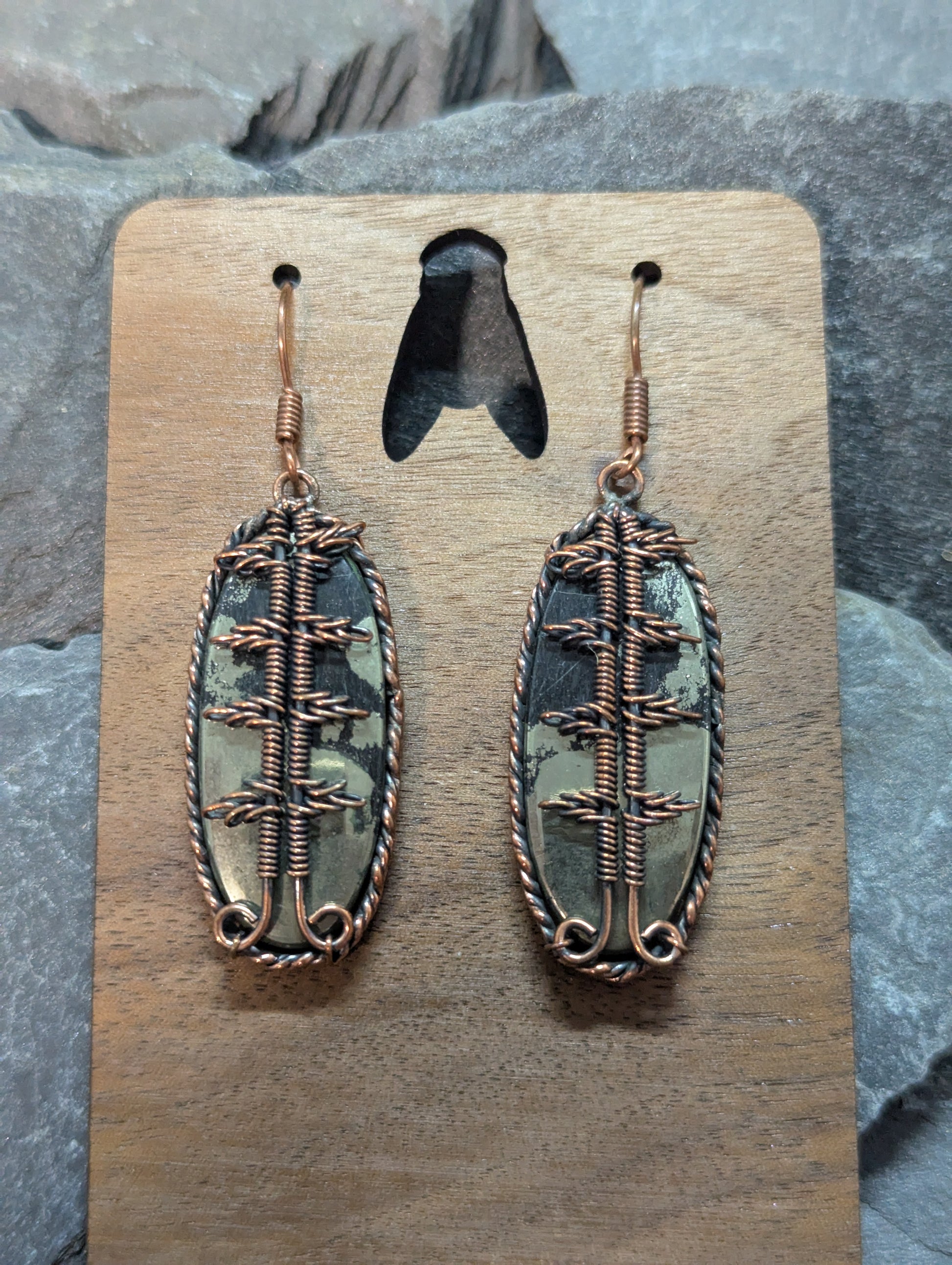 Apache Pyrite Copper Wrapped earrings hand cut and polished.