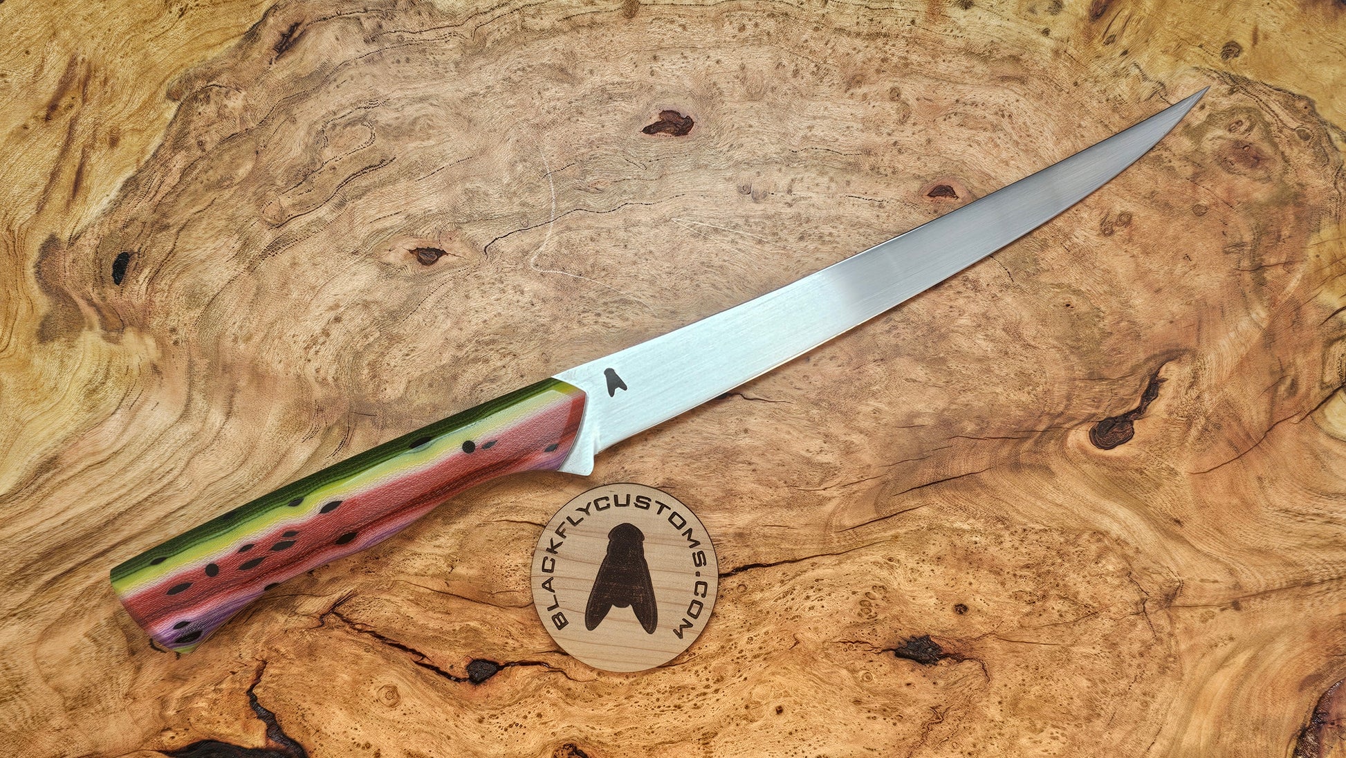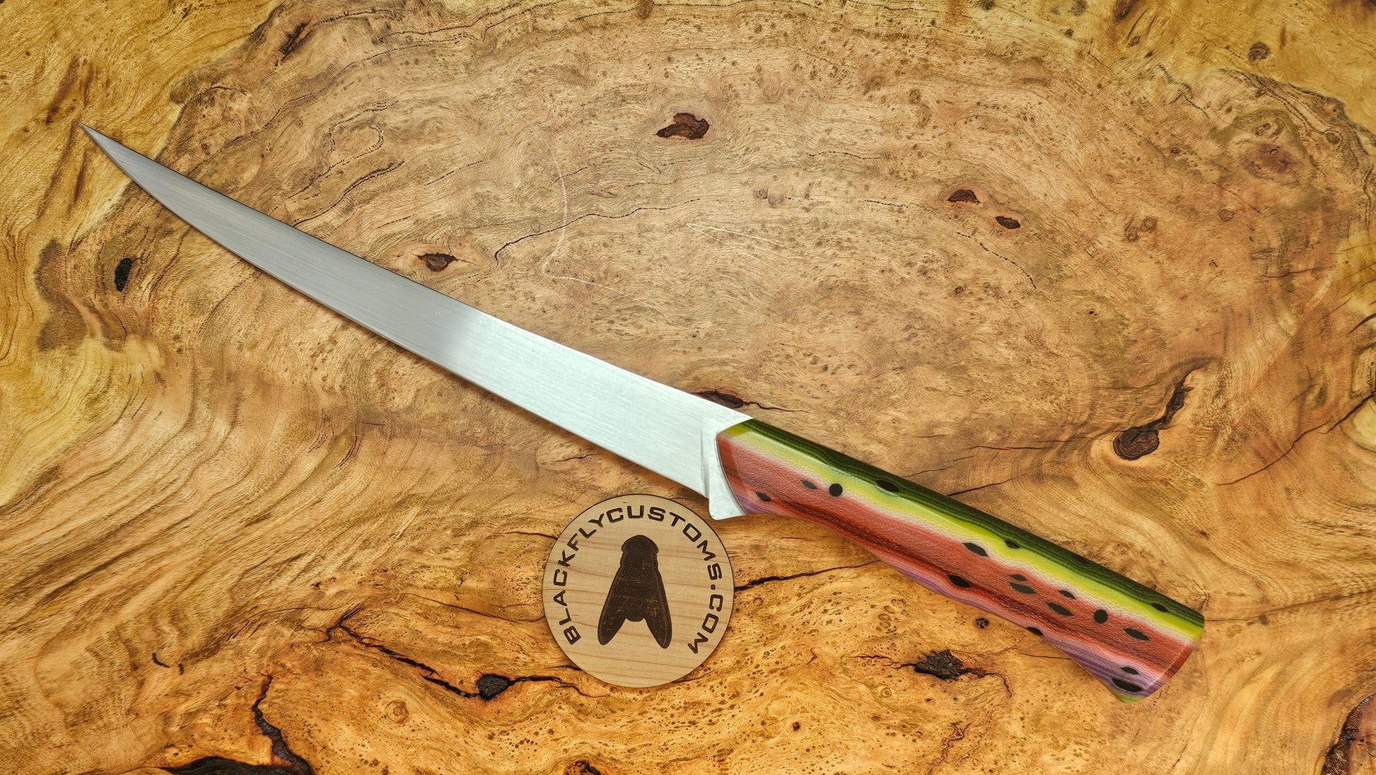 The fillet knife traces its origins to European fishing villages, where craftsmen developed long, thin, and flexible blades to efficiently process fish for market and preservation. Over time, the design spread globally and evolved with stainless steel and ergonomic handles, becoming essential in both commercial fisheries and home kitchens. Can also be used as a boning knife.