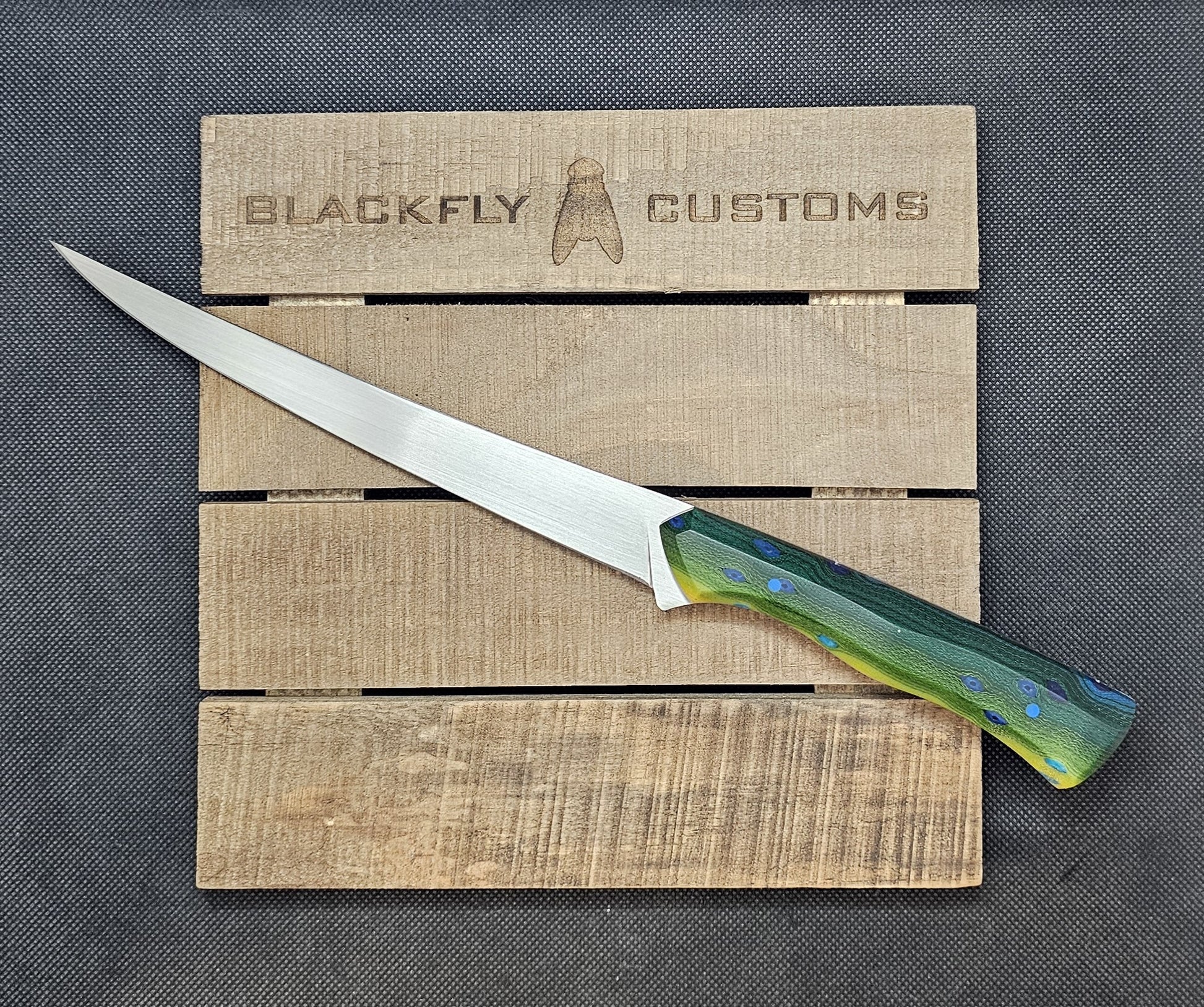 Mahi-Mahi patterned Micarta with Blue G10 pins